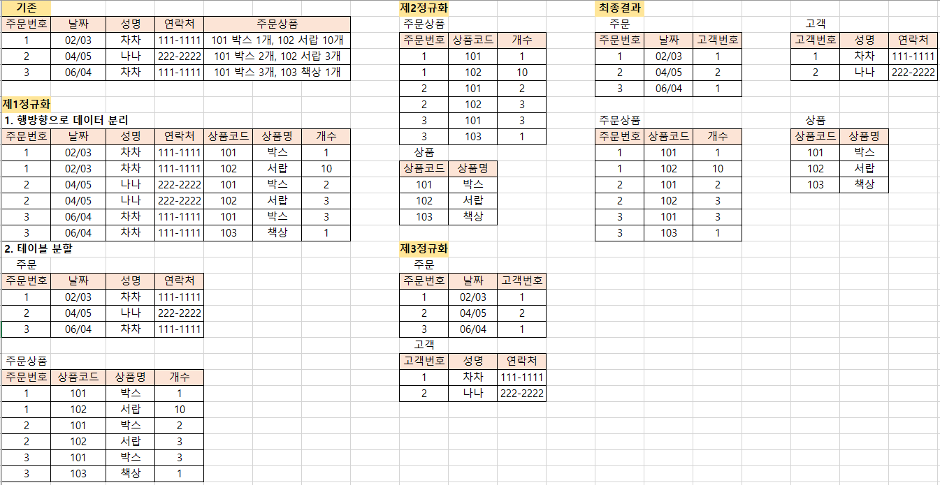 - 정규형(Normal Form): 이상현상이 잘 안 생기는 좋은 테이블이 갖추어야 할 조건이다. (제1정규형, 제2정규형, 제3정규형, BCNF 등)