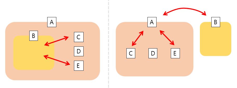 기존에 a의 내부에 있는 b는 c,e 등에 관계 의존성을 가지고 있다.