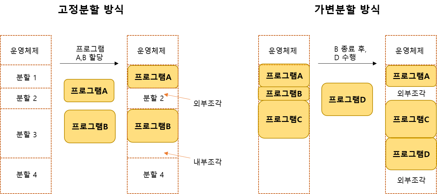 - 고정분할 방식 : 사용자 프로그램이 들어갈 부분을 파티션으로 미리 나눠놓는 방식이다. 동시에 메모리에 올릴 수 있는 프로램에 제한이 있으며 수행가능한 프로그램의 최대크기에 제한이 있다. 외부조각과 내부조각이 발생할 수 있다. 외부조각은 사용이 안 된 메모리공간이나 현재 상태에서 사용하기엔 작아서 사용될 수 없는 공간을 의미한다. 내부조각은 분할된 메모리 공간을 사용하고 남는 공간을 의미한다.